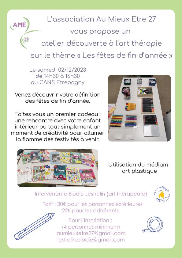 Intervenante pour l'association Au mieux être , je vous propose un atelier découverte en art thérapie à Etrepagny. Le thème sera “Les fêtes de fin d’année”, venez prendre du temps pour vous et votre enfant intérieur.